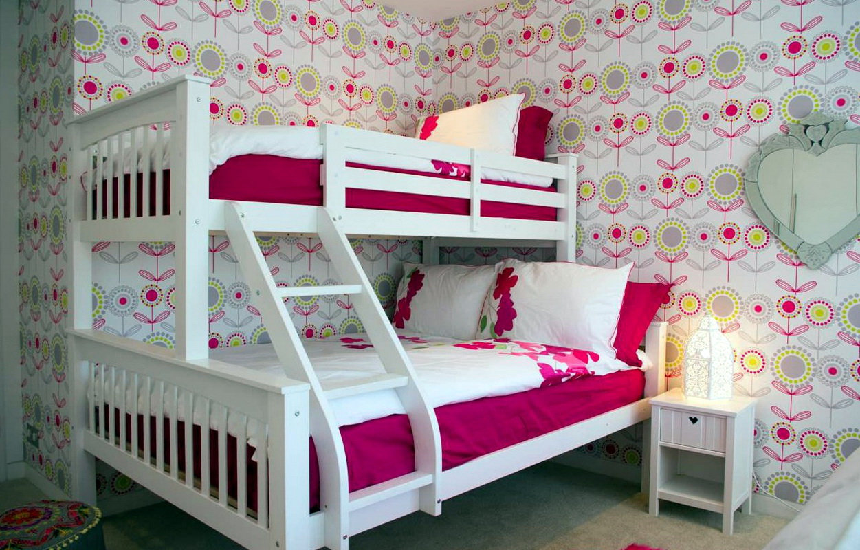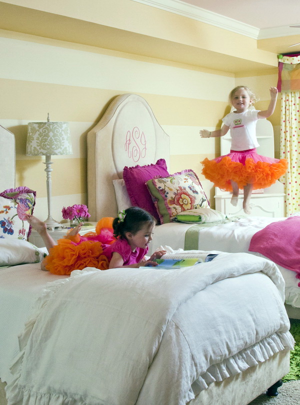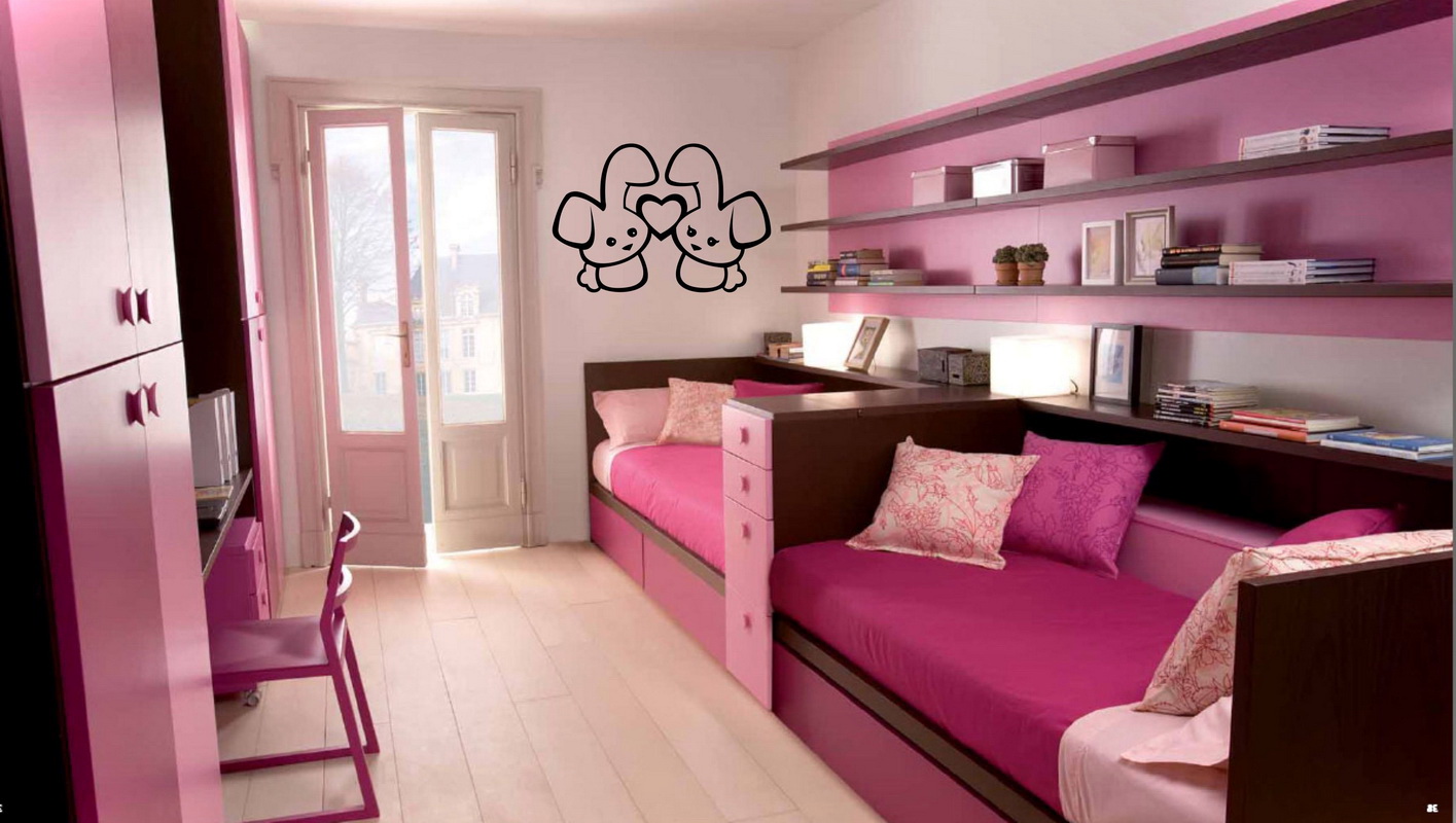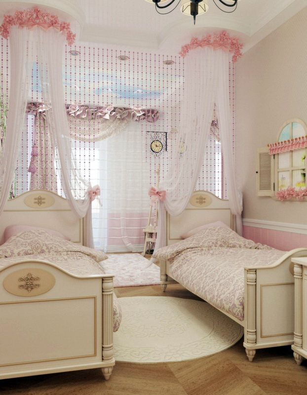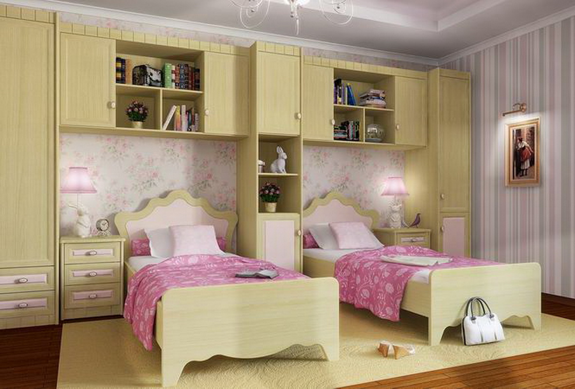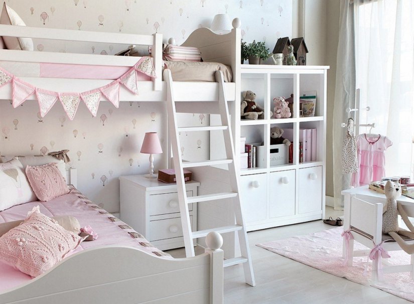 La tâche principale de l'aménagement est de zoner la chambre des enfants afin que les petites femmes au foyer puissent, séparément les unes des autres, vaquer à leurs occupations. Il existe des approches de base pour la planification: l'égalité des espaces communs ou la création de l'espace propre à chaque fille selon son désir. Cela dépend de l'âge, des préférences des sœurs. Les filles ont besoin d'un lit séparé.