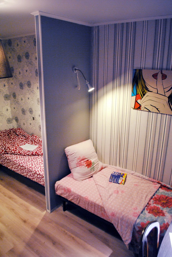 La cloison entre les lits ne prend pas beaucoup de place, divisant la pièce en zones. Les étagères intégrées peuvent être utilisées pour décorer ou stocker des livres