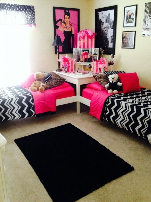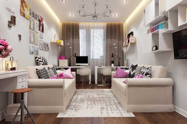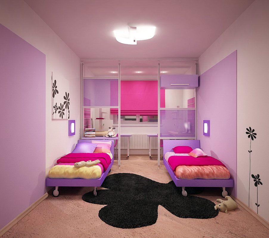 Une caractéristique de l'organisation de la chambre d'une paire de jeunes femmes du même âge est la possibilité de combiner les zones de jeu, les travailleurs et la détente. Cela vous permet de dessiner rationnellement la zone disponible, sans encombrement.