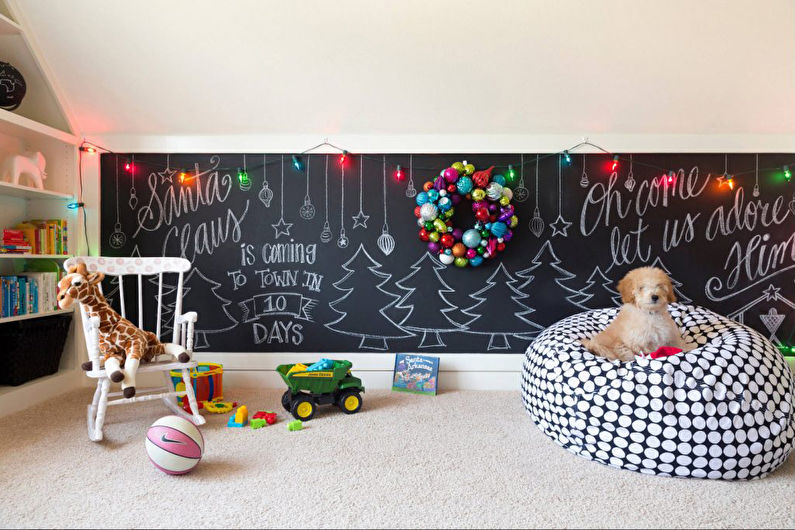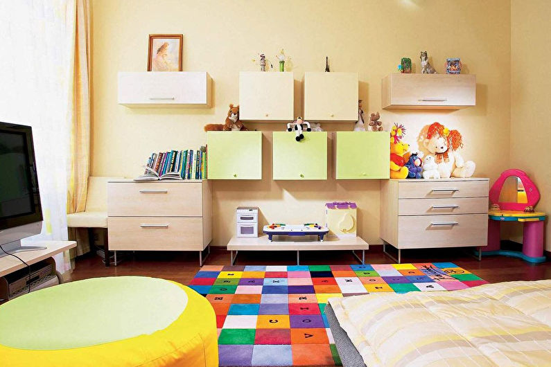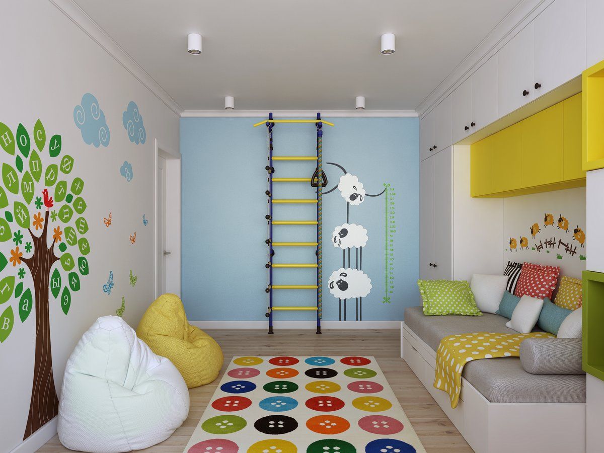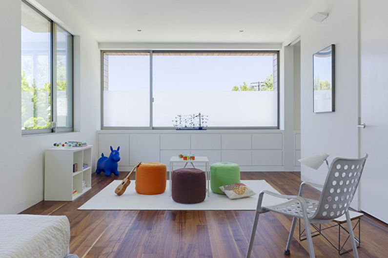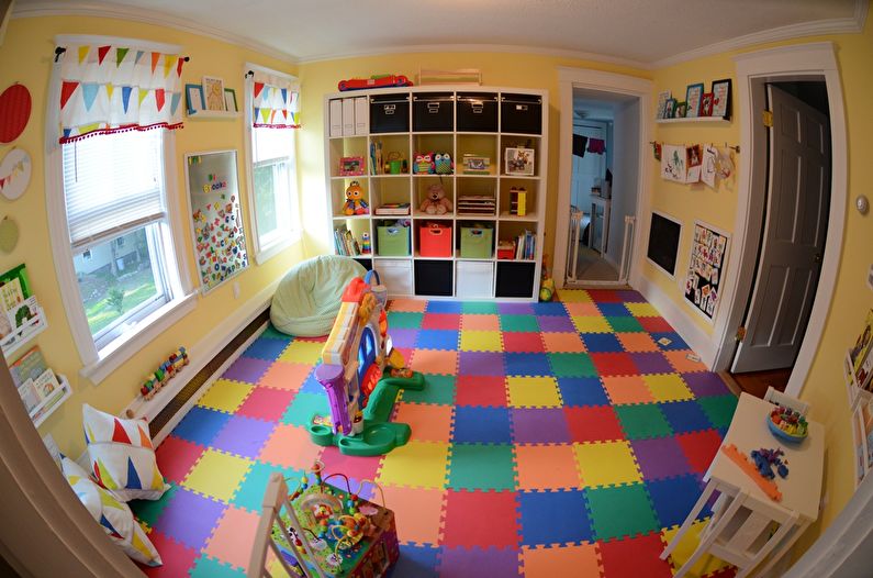 La zone de passe-temps actif est importante jusqu'à un certain âge. Retirez les coins tranchants, placez les meubles près des murs, en laissant le centre vide. La situation doit être totalement sûre, propice. La pièce peut être zonée avec des étagères, un mur suédois, des échelles, des échelles de cordes.