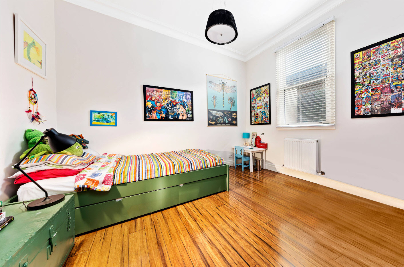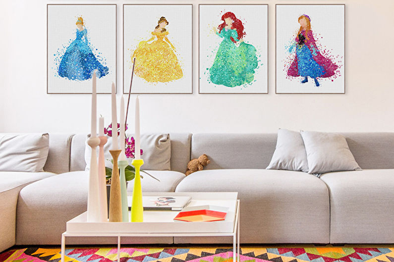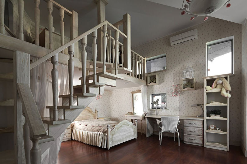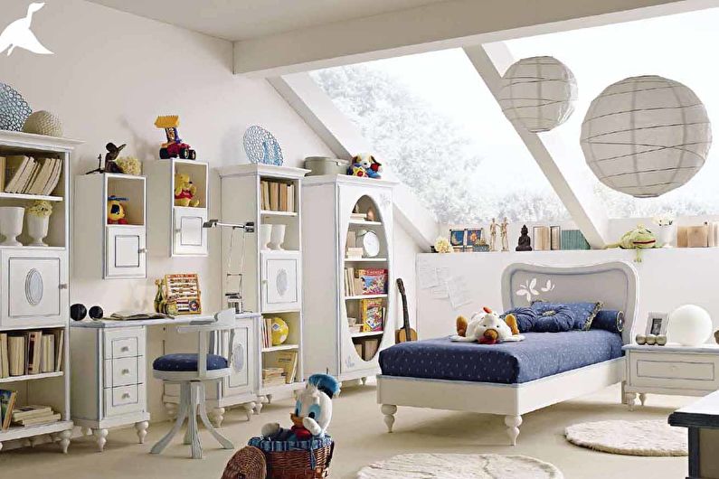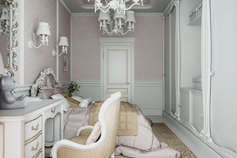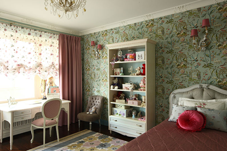 Les rideaux peuvent être longs au sol ou courts avec du tulle. Pour l'originalité, ajoutez un lambrequin. Comme accessoires, des oreillers de différentes tailles, des peintures, un beau tapis, une cheminée et des objets d'artisanat pour enfants décorés dans un cadre sont parfaits.Le style néoclassique de la pièce implique une combinaison de modernité et de classiques - gadgets pour enfants, volets, plafond tendu et mobilier classique.