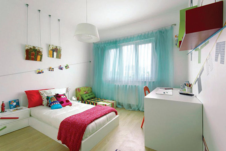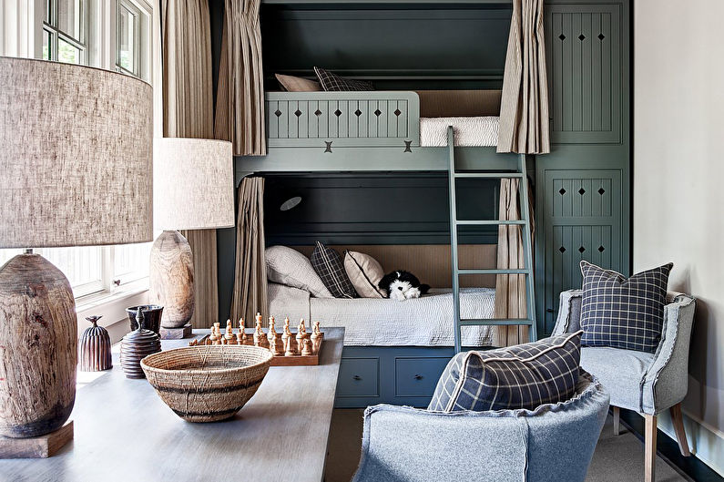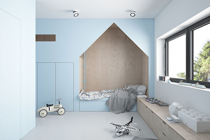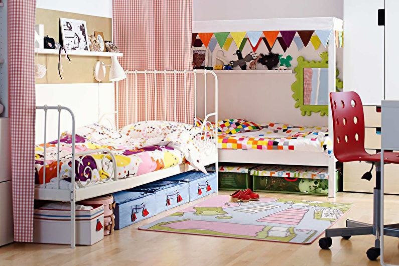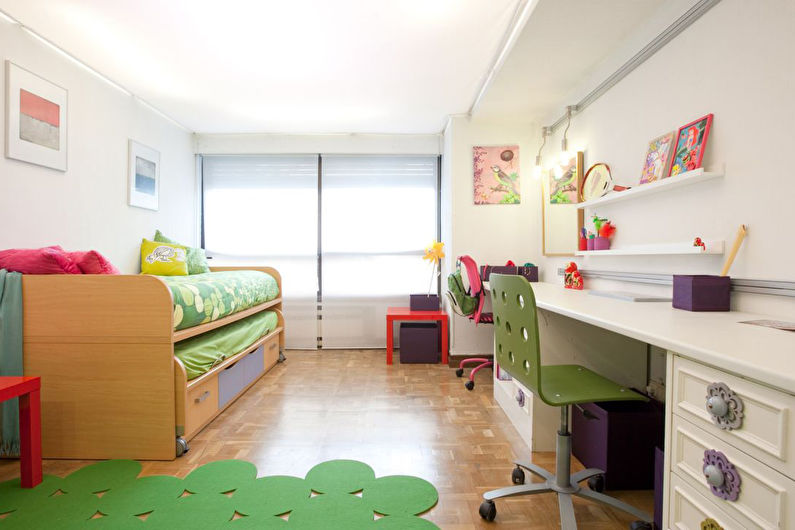 Emplacement - contre le mur ou au centre. Si les enfants sont hétérosexuels, les lits bébé peuvent être séparés ou superposés. Un petit canapé ou un canapé pour les jeux est recommandé. Vous pouvez diviser la pièce avec des rideaux, un podium ou des étagères pour les petits objets, les livres, les jouets. Une armoire en placoplâtre a l'air bien - elle est légère et compacte. Une bonne solution pour les enfants d'âge préscolaire - un lit - un grenier, avec une niche et une armoire. Un bureau, une étagère, une chaise sont compacts dans une niche.
