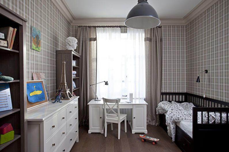 Vous ne devez pas choisir beaucoup de couleurs vives - cela viole la concentration de l'attention, interfère avec l'apprentissage. La chambre d'enfant pour un garçon, sa conception et un exemple sur la photo peuvent être consultés sur le site de conception. Choisissez des couleurs calmes: bleu clair, gris, blanc, crème.