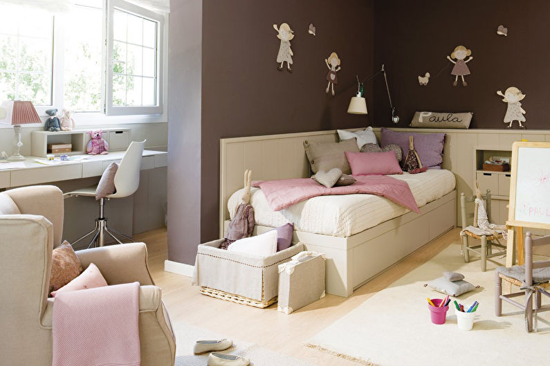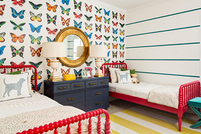 - Sélectionnez soigneusement les nuances des surfaces - trop de contrastes exercent une pression sur la psyché des enfants fragiles. Pour ne pas vous tromper, choisissez des couleurs claires et chaudes, de préférence pastel. Il s'agit d'une option universelle - ils peuvent être combinés avec ceux saturés, mettant en évidence, par exemple, un mur. La combinaison doit être harmonieuse avec les meubles. Si vous avez deux enfants, une bonne idée est de séparer les zones de la pièce en choisissant des lits similaires, mais dans des tons différents;