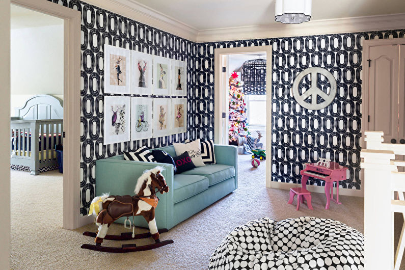 Le coin du jeu peut être collé avec du papier peint 3D avec l'image de personnages de dessins animés, poser un tapis sur le sol ou disposer un sol chauffant. La salle de jeux pour enfants doit être lumineuse, voir photos du designer.Les jouets et les jouets sont stockés dans des paniers, des boîtes, des poufs avec des sièges et des étagères.