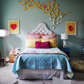 Le mur à la tête du lit est très populaire. Il peut être fait d'un accent, conçu dans des couleurs vives, et en même temps, ne vous inquiétez pas que l'enfant sera surexcité et ne pourra pas dormir.