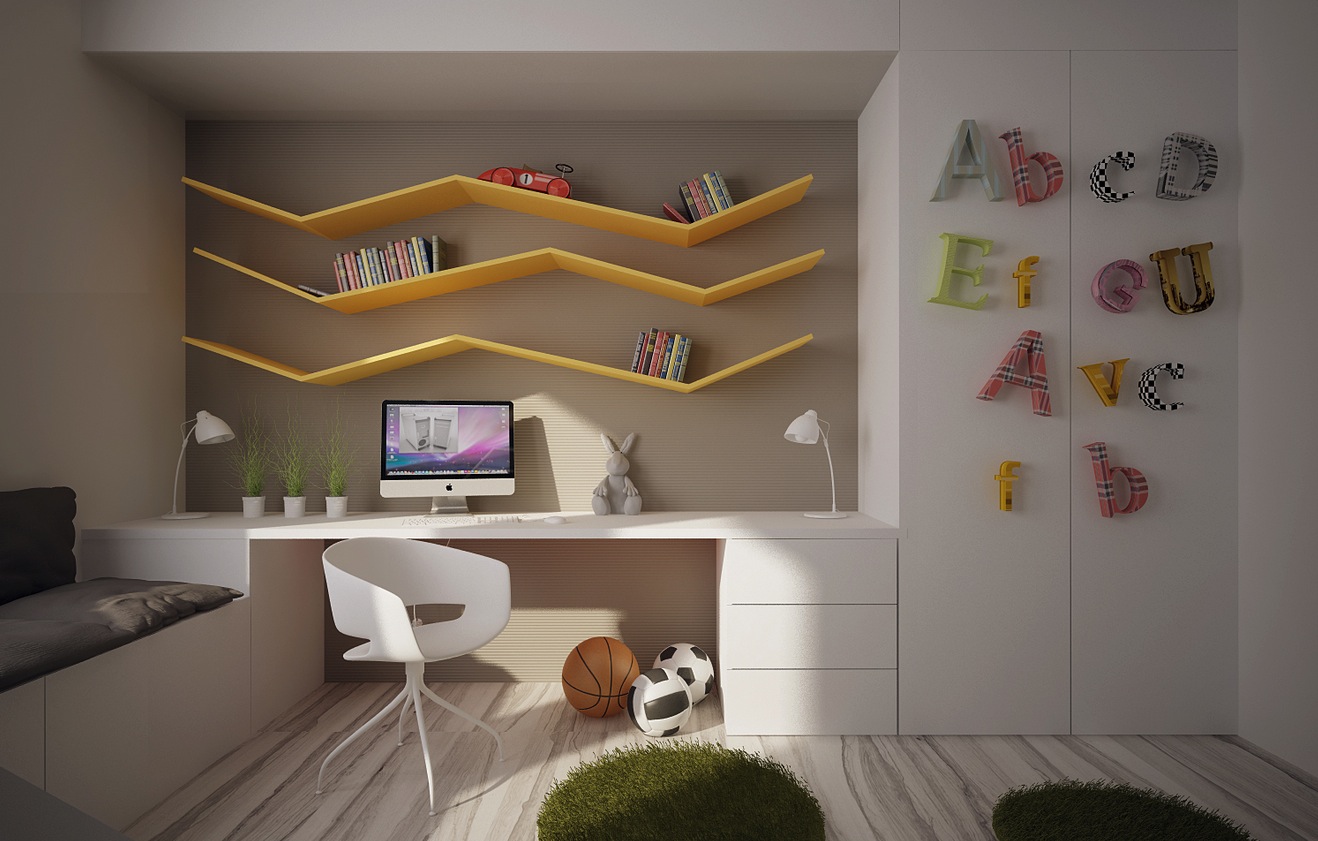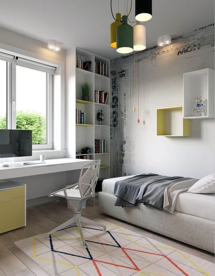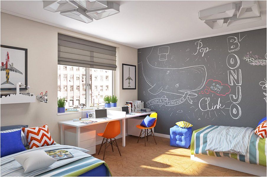 Les adolescents changent leurs intérêts, leurs habitudes et leurs priorités.Les jouets sur les étagères sont remplacés par des livres et des fournitures pour les étudiants. La conception de la salle vise à créer un environnement propice à l'étude et à la créativité. Pour certains adolescents, un intérieur lumineux est nécessaire pour se maintenir en forme, et quelqu'un a besoin d'une palette calme pour étudier et se détendre après les cours.