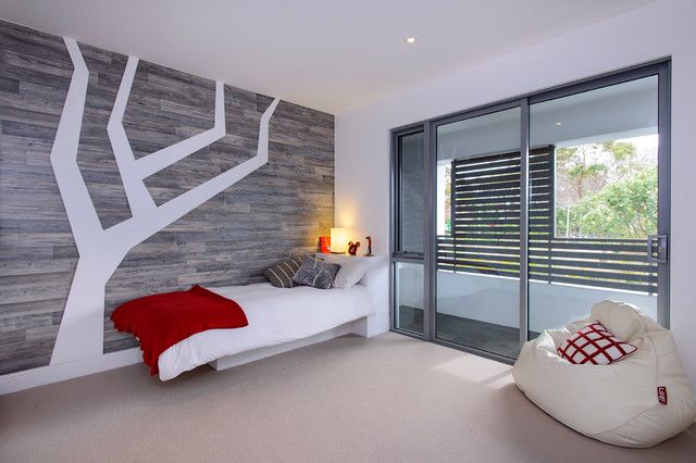Chambre d'enfant de style high-tech avec des murs unis en gris clair