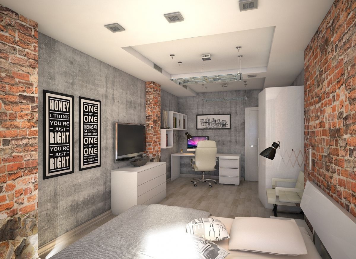 La combinaison de surfaces grises et de briques dans le style loft de la pièce