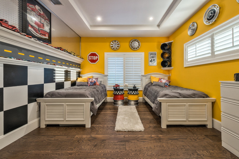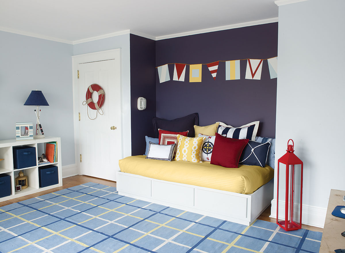 Les garçons inventent ou refont constamment quelque chose, reconstruisent. C'est sur le changement rapide de nuances et de formes que vous devez faire attention. La base est meilleure pour prendre des tons calmes. Par exemple, vous pouvez utiliser différentes nuances de bleu ou de bleu. Les murs solides complètent parfaitement les illustrations, les motifs ou les dessins colorés.