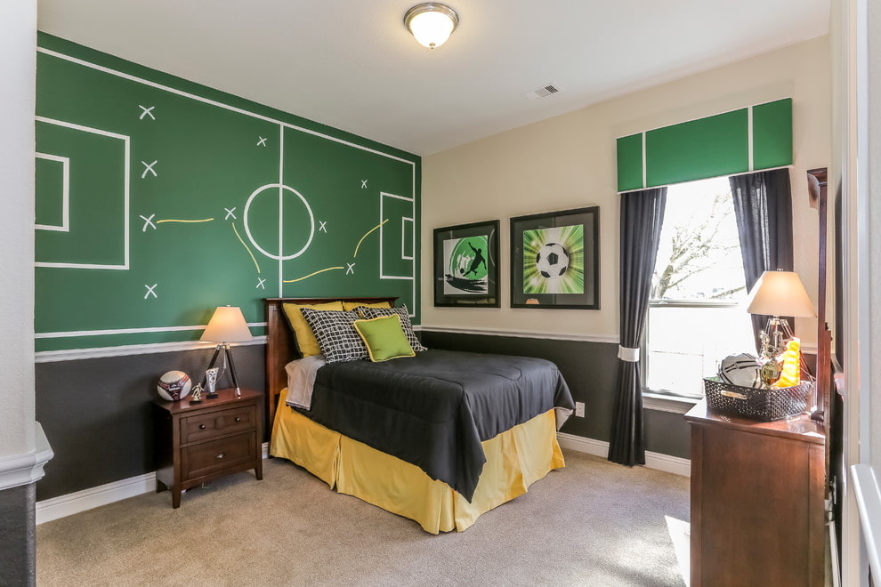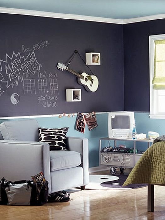 Si la pièce a une petite surface, il est préférable de la faire dans des couleurs vives et d'ajouter de la luminosité, dessinez un mur d'accent en couleurs saturées et lumineuses, et l'enfant devrait peindre le mur avec des peintures acryliques. Ainsi, un adolescent pourra se vanter d'une atmosphère insolite devant des amis.