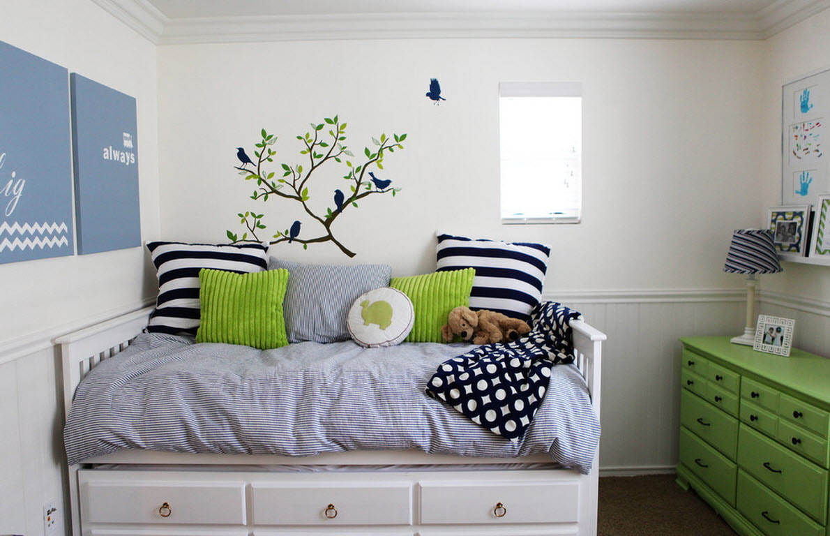 Peindre les murs d'un seul ton peut sembler une idée ennuyeuse, mais c'est très pratique. Les enfants grandissent rapidement, donc décorer les murs unis avec des autocollants spéciaux, des autocollants aideront à transformer et, si nécessaire, à changer la couleur unie de la chambre des enfants. Cette option permettra d'économiser de l'argent, tout en étant assez facile pour recharger l'espace de la chambre des enfants.