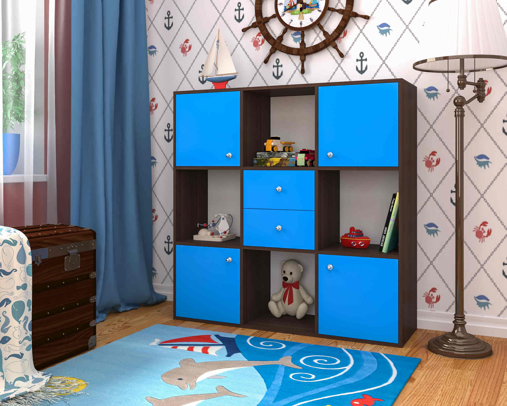 Étagère - haute, allongée et droite, adaptée à une petite pièce. Il peut être complètement fermé, complètement ouvert ou combiné, avec des étagères et des portes ouvertes. La trousse est très pratique pour ranger des livres et des fournitures scolaires, des jouets et des vêtements pour bébé.