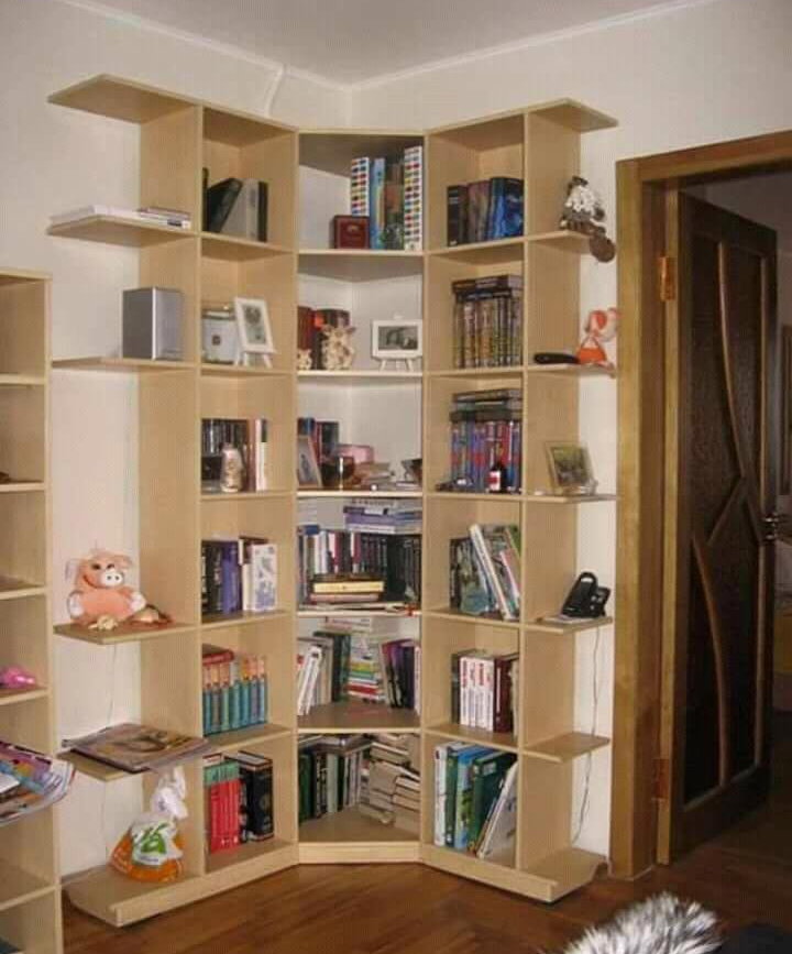 Sur les étagères d'angle, vous pouvez empiler non seulement des livres, mais aussi toutes sortes de décoration. Et les étagères supérieures prennent des plantes d'intérieur.