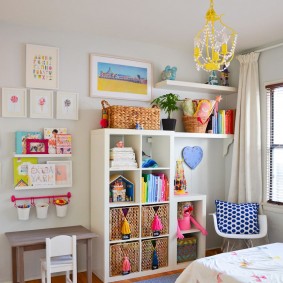 Et les étagères dans leur praticité et leur simplicité. Ils peuvent être utilisés comme étagères pour des livres et des manuels, organiser des jouets, un décor de magasin et même des vêtements. Un autre avantage - les racks sont disponibles dans une variété de formes et de tailles incroyables, et vous pouvez choisir ou commander pour les dimensions individuelles de la pièce.