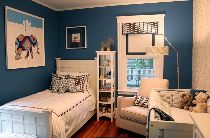 Un bon meuble blanc aura un contraste avec les murs sombres, par exemple le bleu. S'il s'agit d'une chambre de garçon, vous pouvez décorer les murs avec du bleu, les rideaux avec des rayures bleues et blanches et une bibliothèque blanche. Thème marin et très élégant!