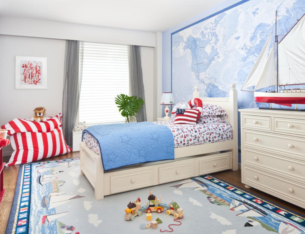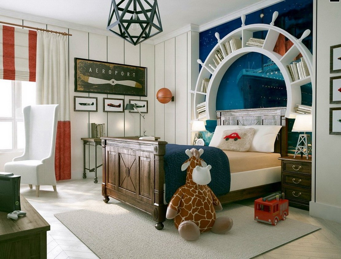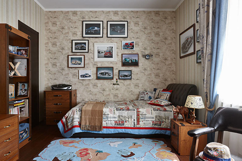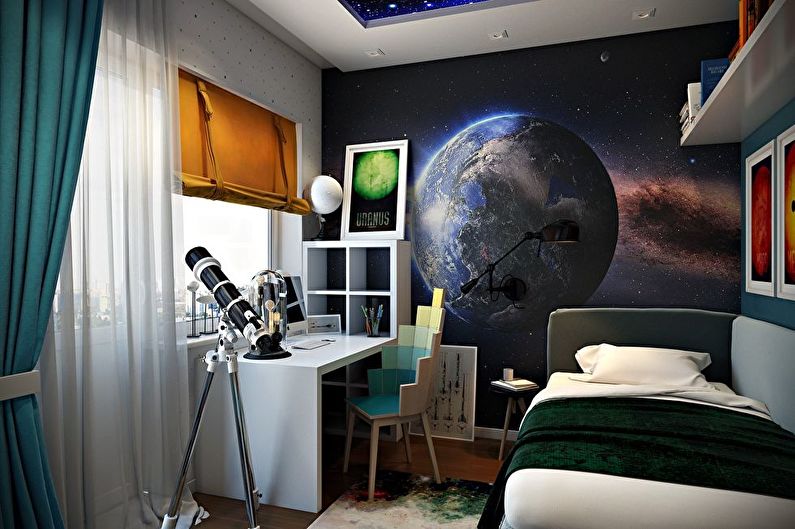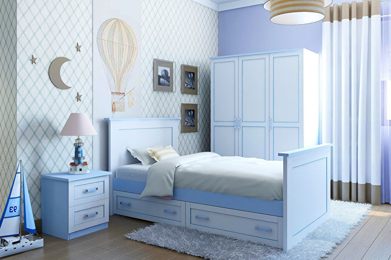 Options pour un garçon. Les nuances froides sont préférées: bleu clair, gris, bleu. Pour la chambre du garçon, les thèmes marins, les fonds d'écran avec des machines à écrire, les héros de bandes dessinées préférés, etc. seront pertinents.