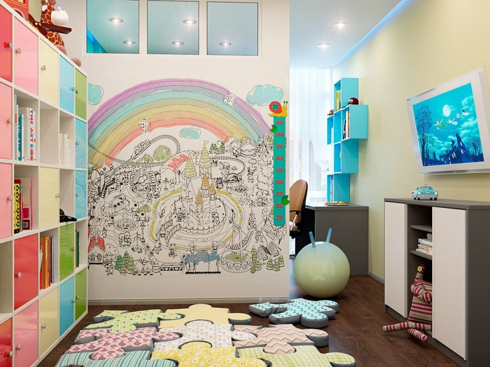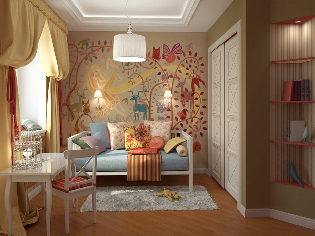 Les peintures murales à l'image de vos personnages de contes de fées ou de dessins animés préférés s'intégreront parfaitement dans une telle pièce.