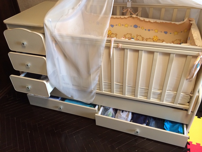 Un berceau transformateur comme sur la photo prend peu de place, de nombreux tiroirs sont conçus pour ranger les choses.