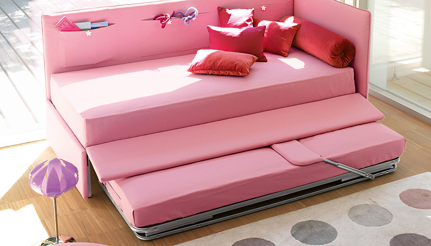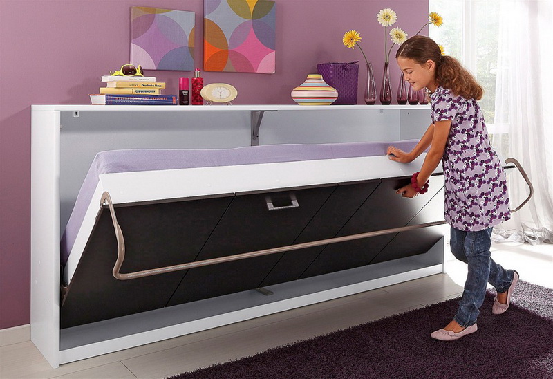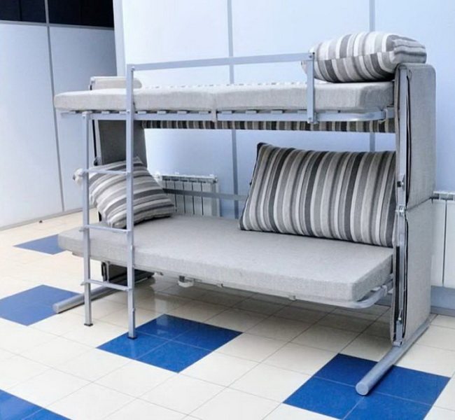 Le mobilier multifonctionnel pliant ou coulissant est disponible en plusieurs versions: à partir de modules préfabriqués, armoire, avec rembourrage doux. Les canapés pliants pour enfants se combinent avec des étagères à charnières, des armoires, des tiroirs pour ranger les plus nécessaires.