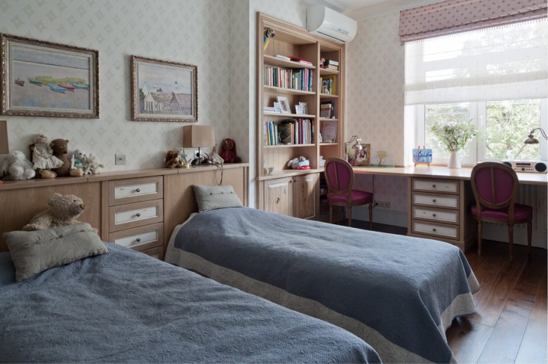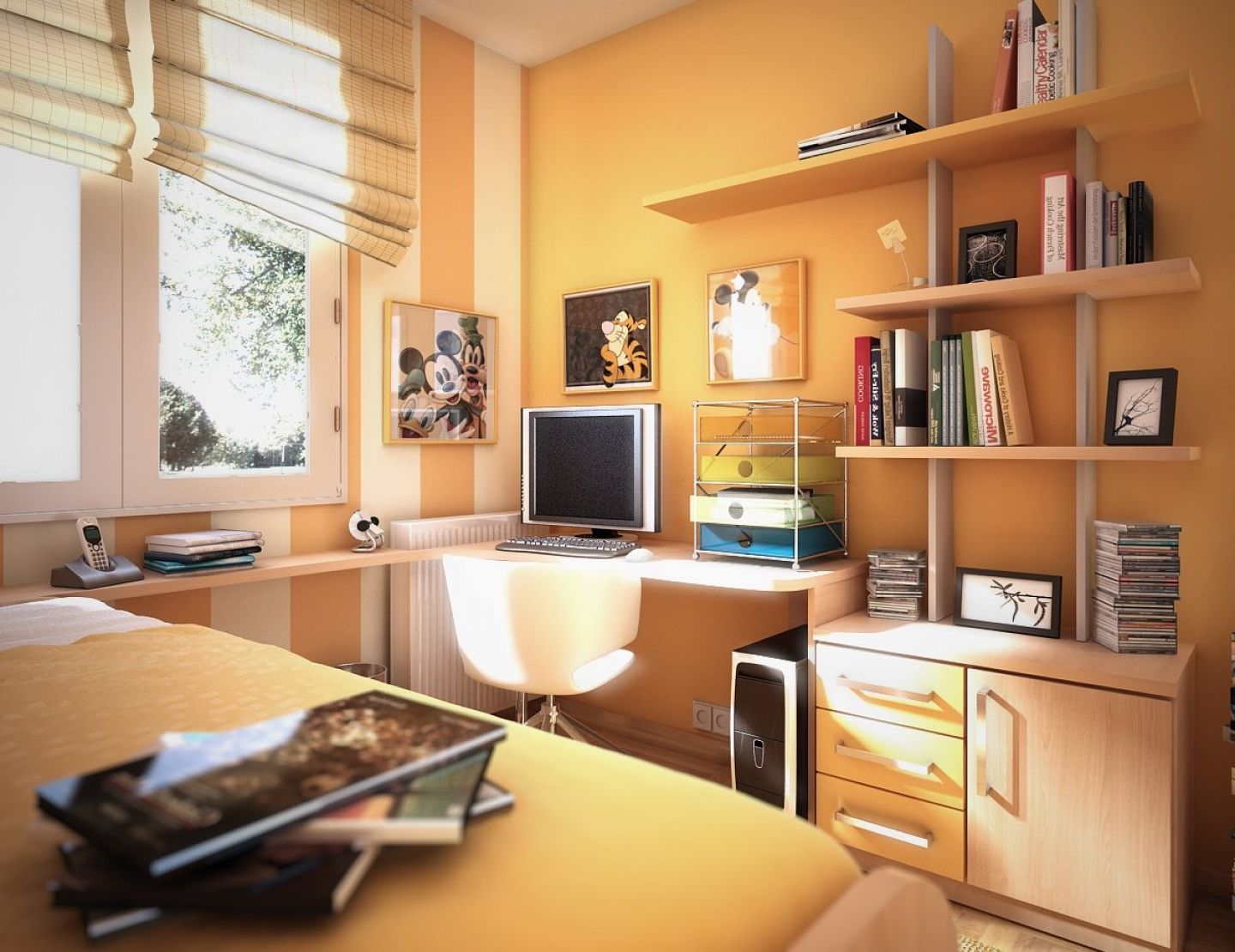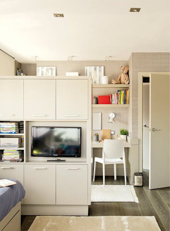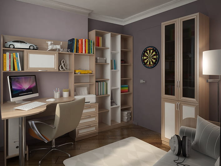 Dans la chambre des élèves, un placard pour les vêtements, des étagères pour les livres, un endroit pour ranger les cahiers et de nombreuses fournitures scolaires sont absolument nécessaires. Tout cela peut être combiné en une paroi commune, angulaire ou droite, avec différents compartiments. Des supports légers conviennent également, sur lesquels tout peut être facilement placé.