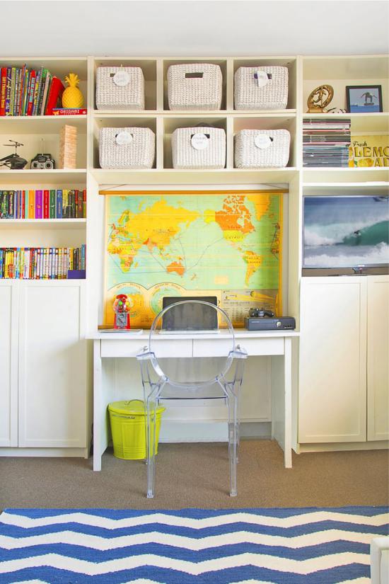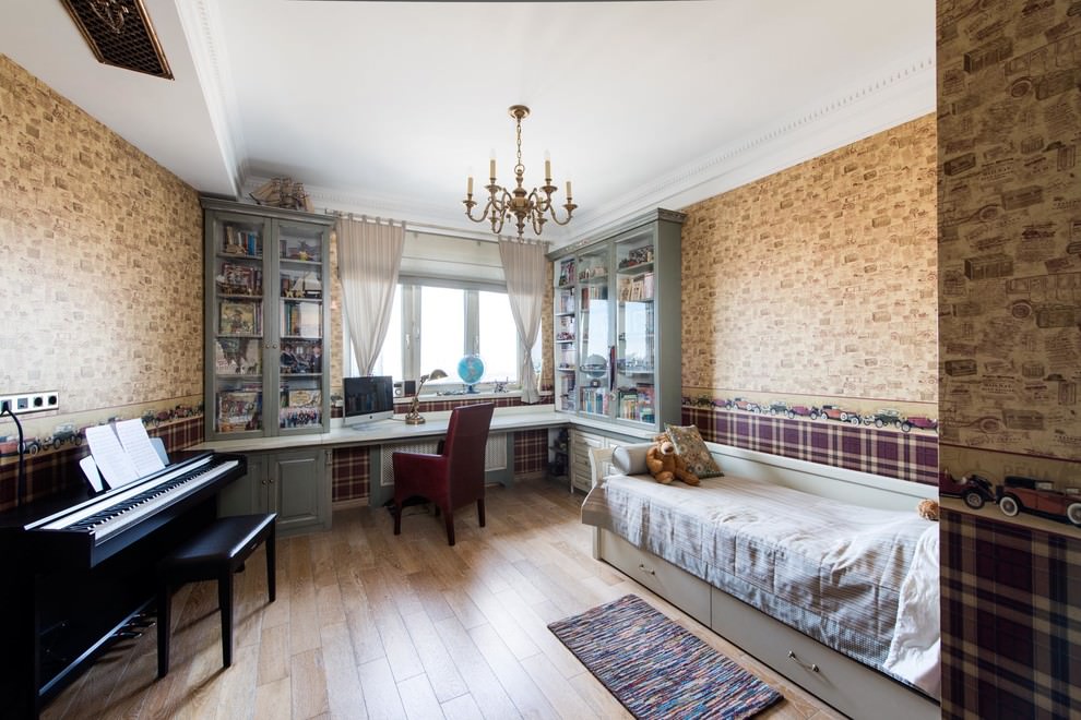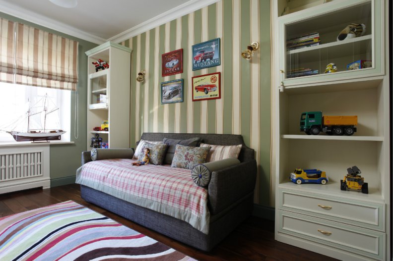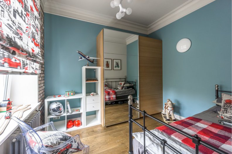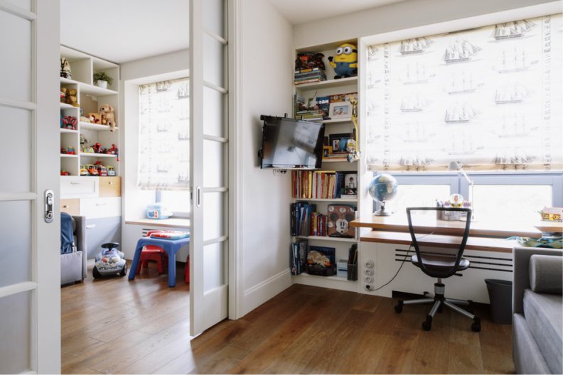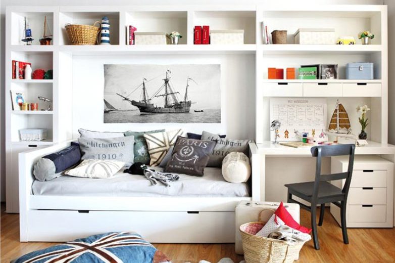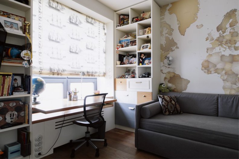 Chambre de garçon avec une couchette dans la niche murale, qui contient également des tiroirs, des étagères et une armoire