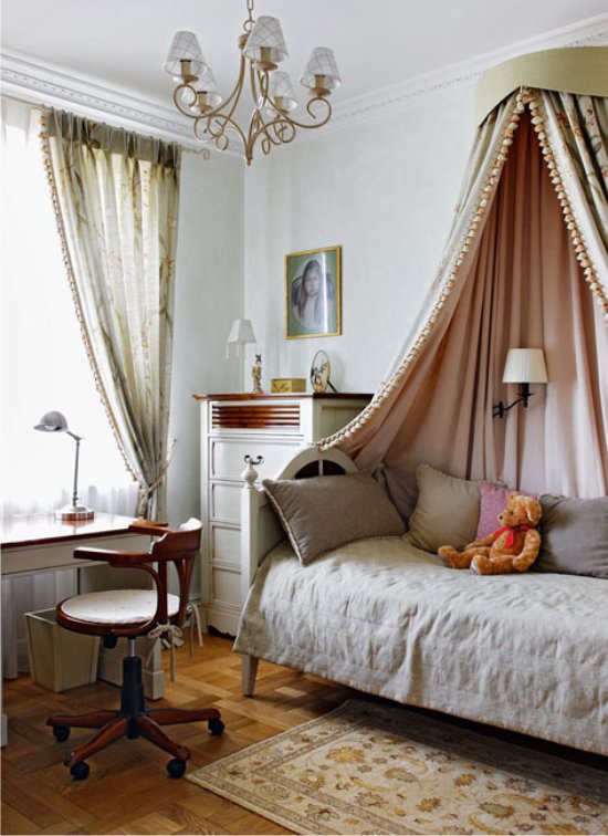 La zone de couchage doit être un coin confortable et isolé séparé. Il est préférable de suspendre généralement un beau rideau léger (ou un boudoir pour la chambre de la fille), ou d'utiliser le zonage des meubles (séparez la zone de couchage avec une armoire ou un écran).