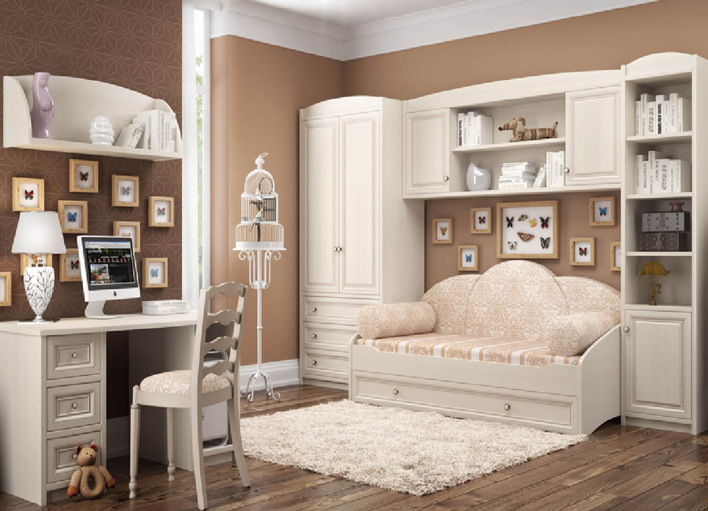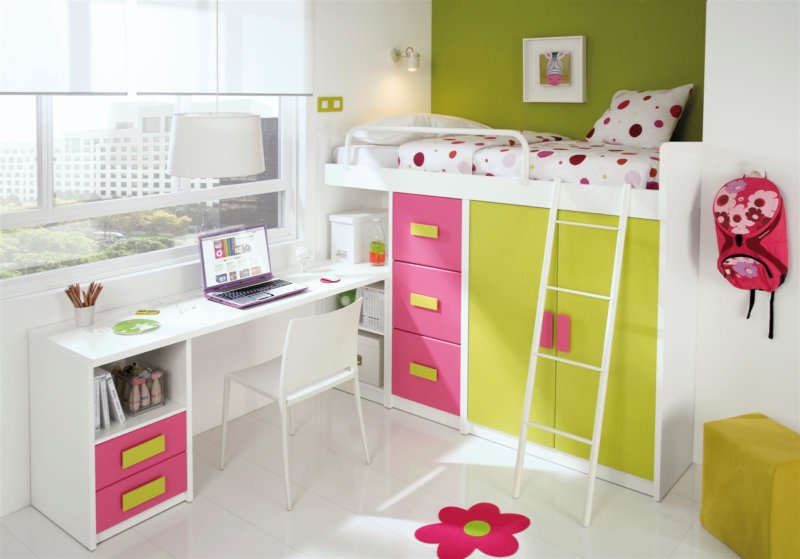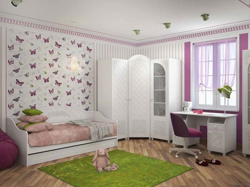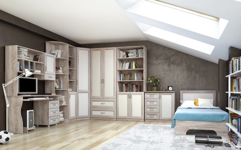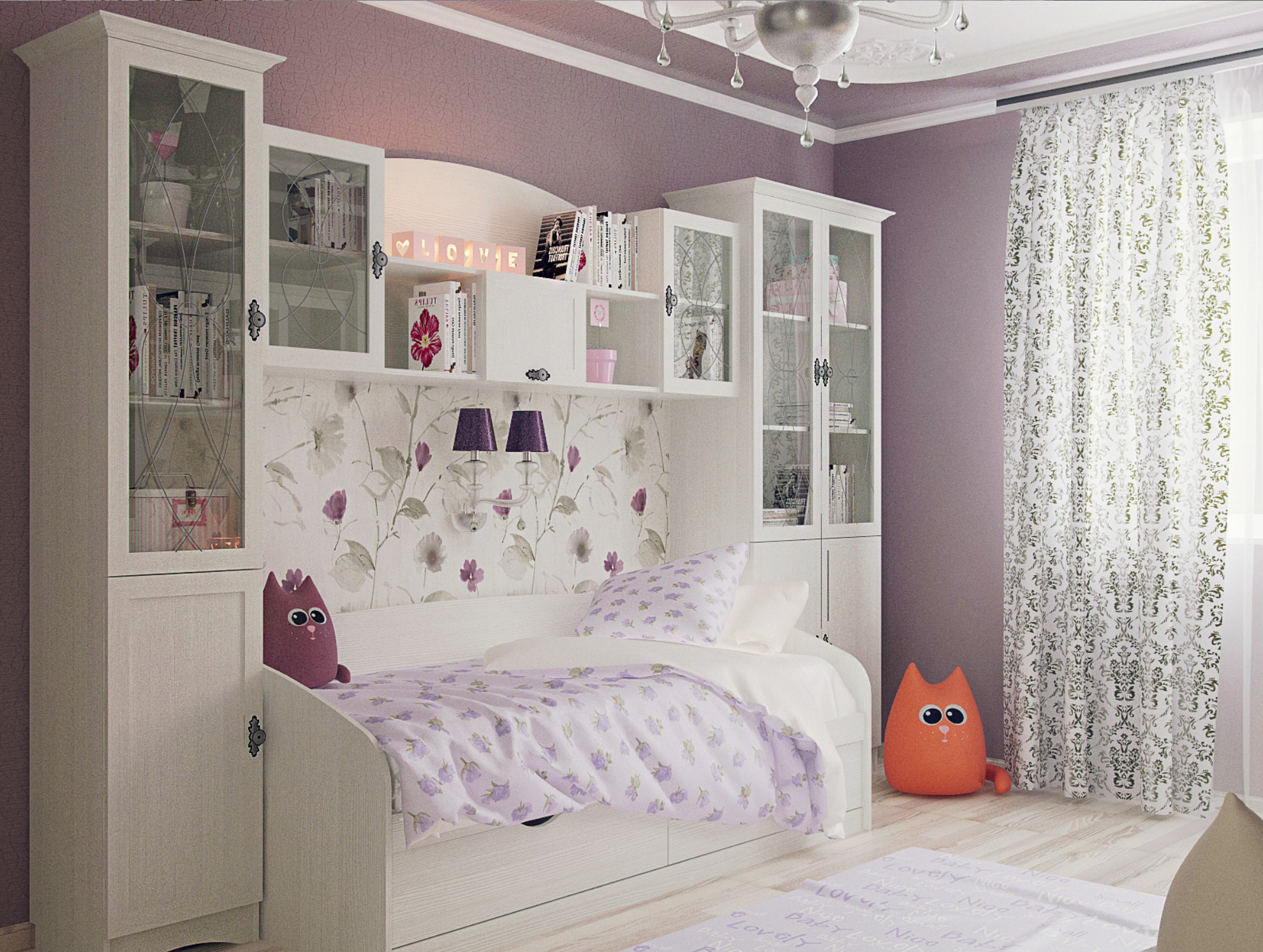 Les adolescents préfèrent le minimalisme, les couleurs modérées. Décorez indépendamment les meubles et les murs avec des images, des affiches. Dans la chambre des filles, il devrait y avoir un module avec un grand miroir, une armoire ou une commode avec un grand nombre de compartiments.