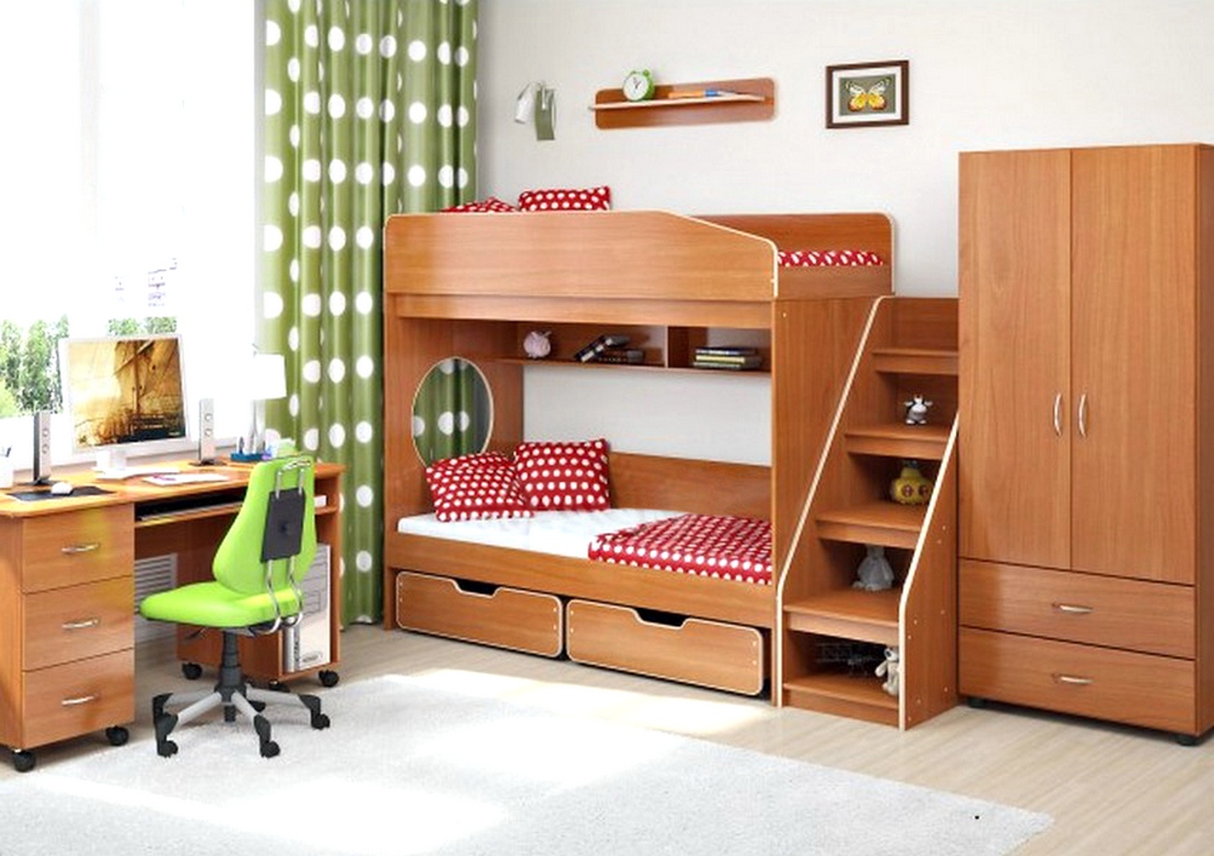 Les systèmes modulaires utilisent souvent des lits mezzanines d'origine avec des escaliers confortables. Lorsqu'il y a deux enfants, vous pouvez choisir un lit superposé confortable. Des tiroirs ou des étagères coulissantes sont fabriqués ci-dessous.