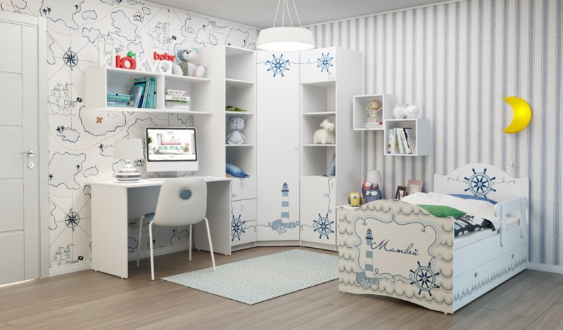 Les enfants plus âgés préfèrent les intérieurs stylisés. Les filles sont faites de princesses, les garçons sont des cubes de navire. La conception thématique peut être classique et originale, cela dépend beaucoup des caractéristiques psycho-émotionnelles des enfants.