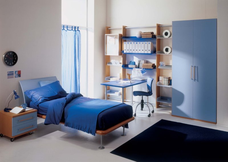 L'intérieur de la chambre du garçon avec des meubles bleus dans le style de Spider-Man
