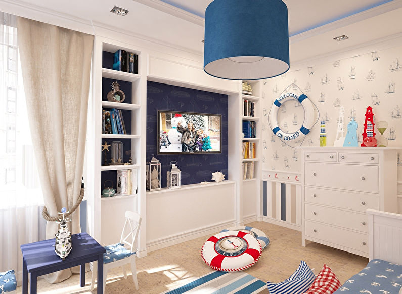 | Marine | Si votre bébé aime la mer, les navires - le style marin est idéal pour la décoration intérieure. Couleur blanche, bleue, rouge utilisée. Ils vont bien avec le bois. Les attributs indispensables sont les accessoires: volant, filets de pêche. |