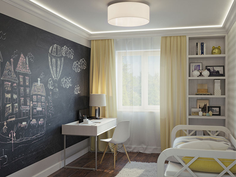 | Moderne | Il se caractérise par le laconicisme, les lignes correctes, les couleurs sobres. Un tel style peut habituer le bébé à commander. Le revêtement mural est généralement uni. L'utilisation de géométrique impressions. |