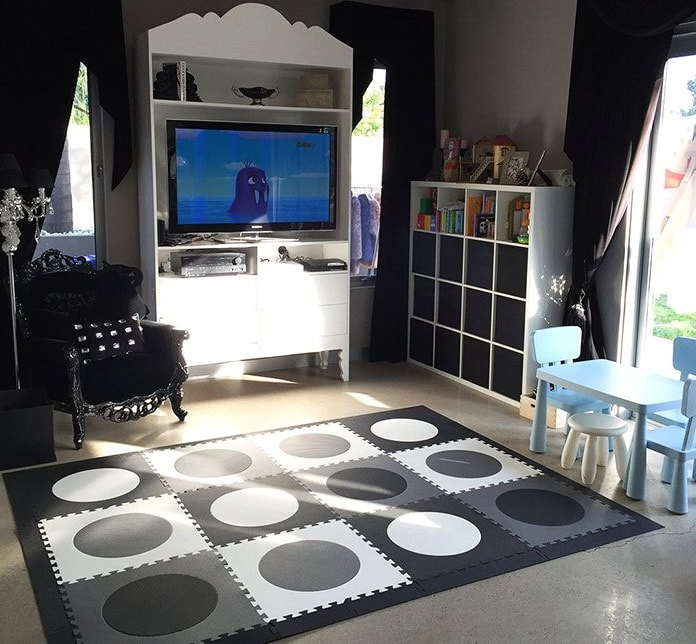 Voici une option similaire. La différence est que les modules sont assemblés sous la forme d'un tapis séparé, qui peut être déplacé sur le côté. Cette option est pertinente pour les familles vivant avec un enfant dans la même pièce. Le tapis sépare visuellement la zone de jeu du reste de l'espace.