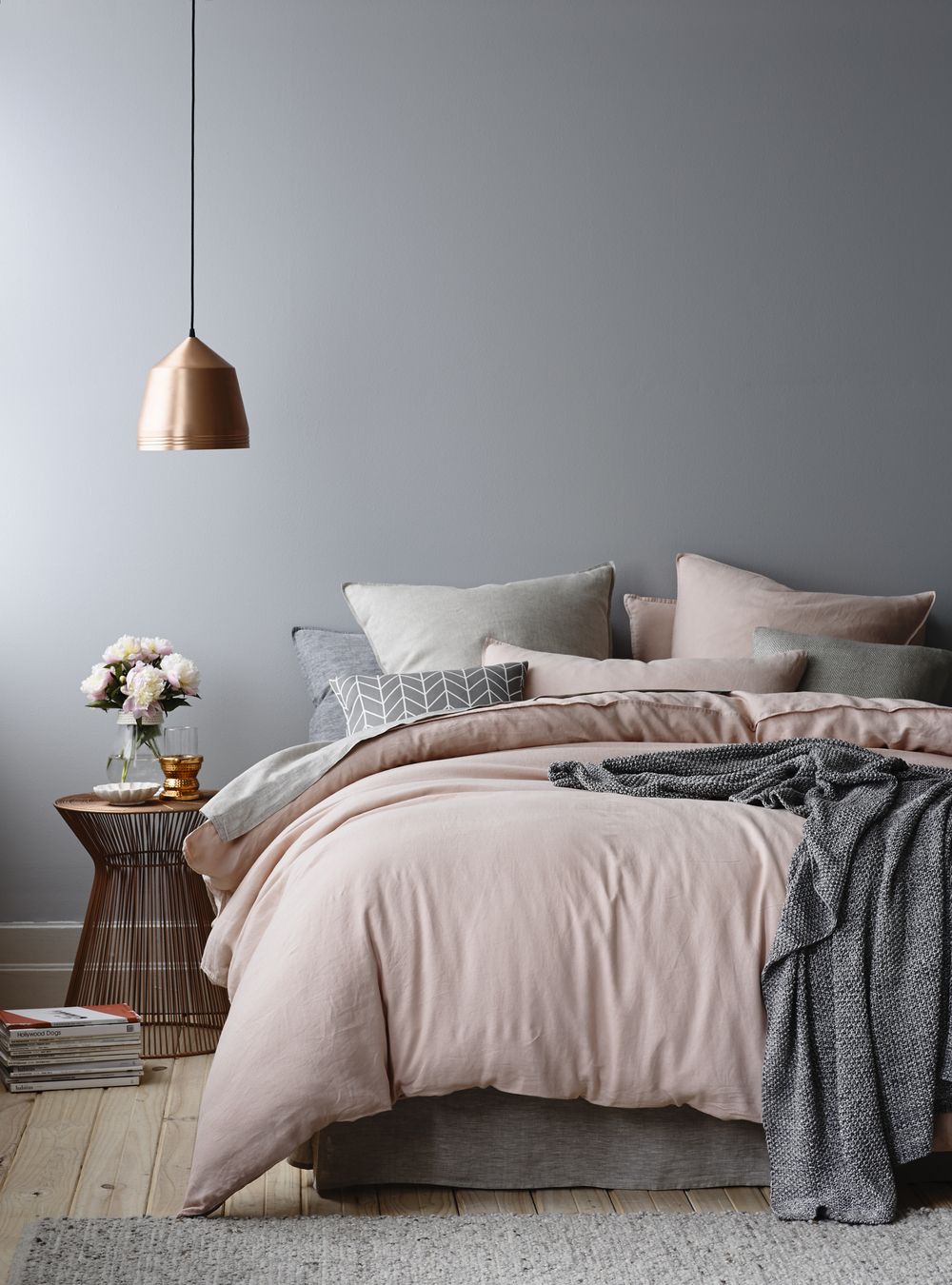 Chambre gris-rose avec un accent jaune en forme de rideau romain pratique