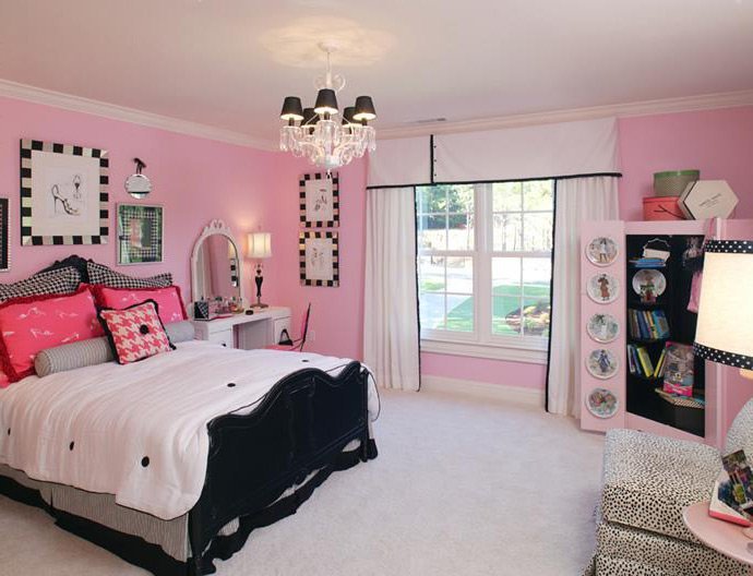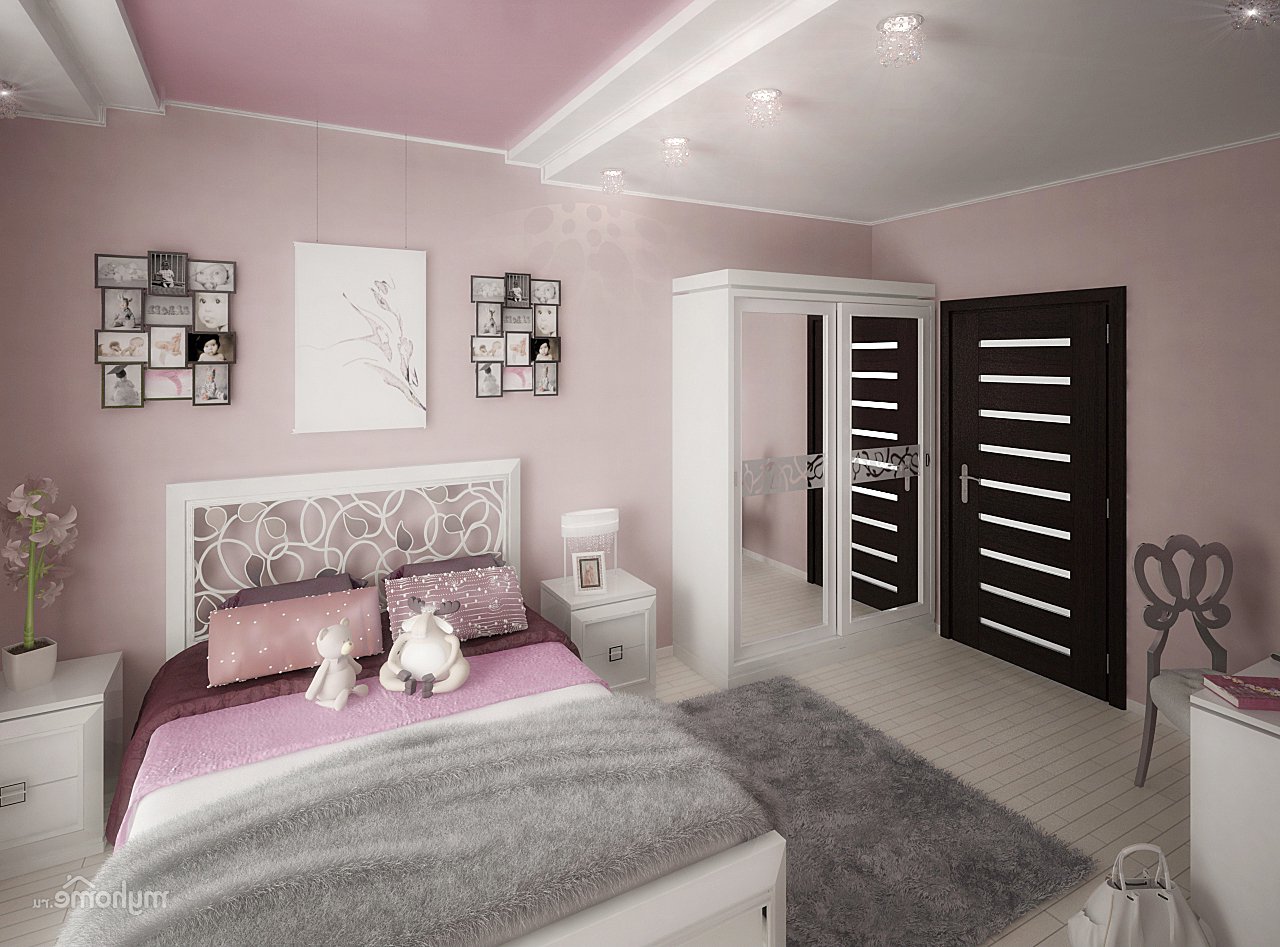 Pour une adolescente, vous devez choisir des meubles plus spectaculaires. Par exemple, un grand lit en métal noir. Le noir se marie parfaitement avec le rose. Au lieu du placard habituel pour un adolescent, il est préférable d'acheter un placard avec des miroirs pleine longueur.