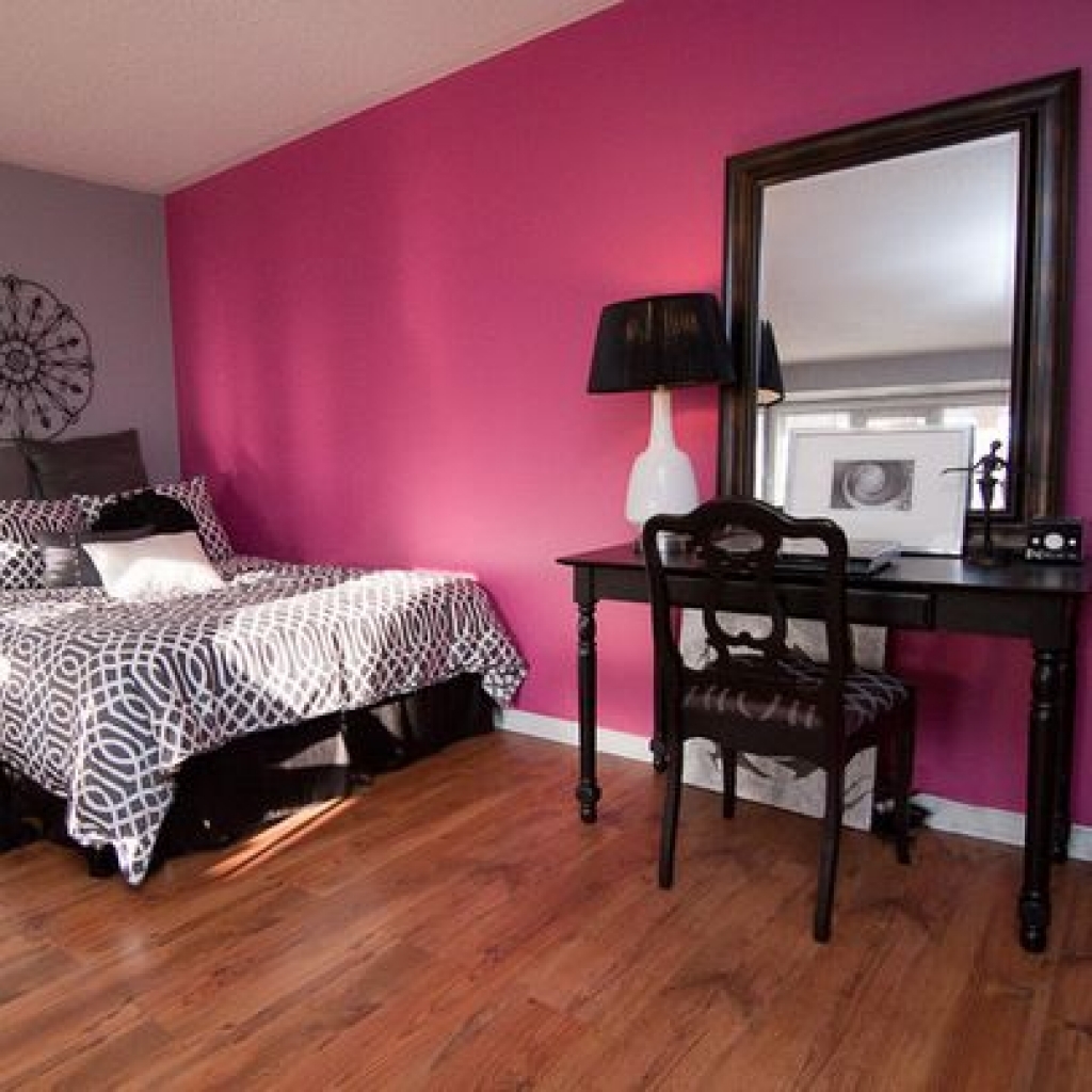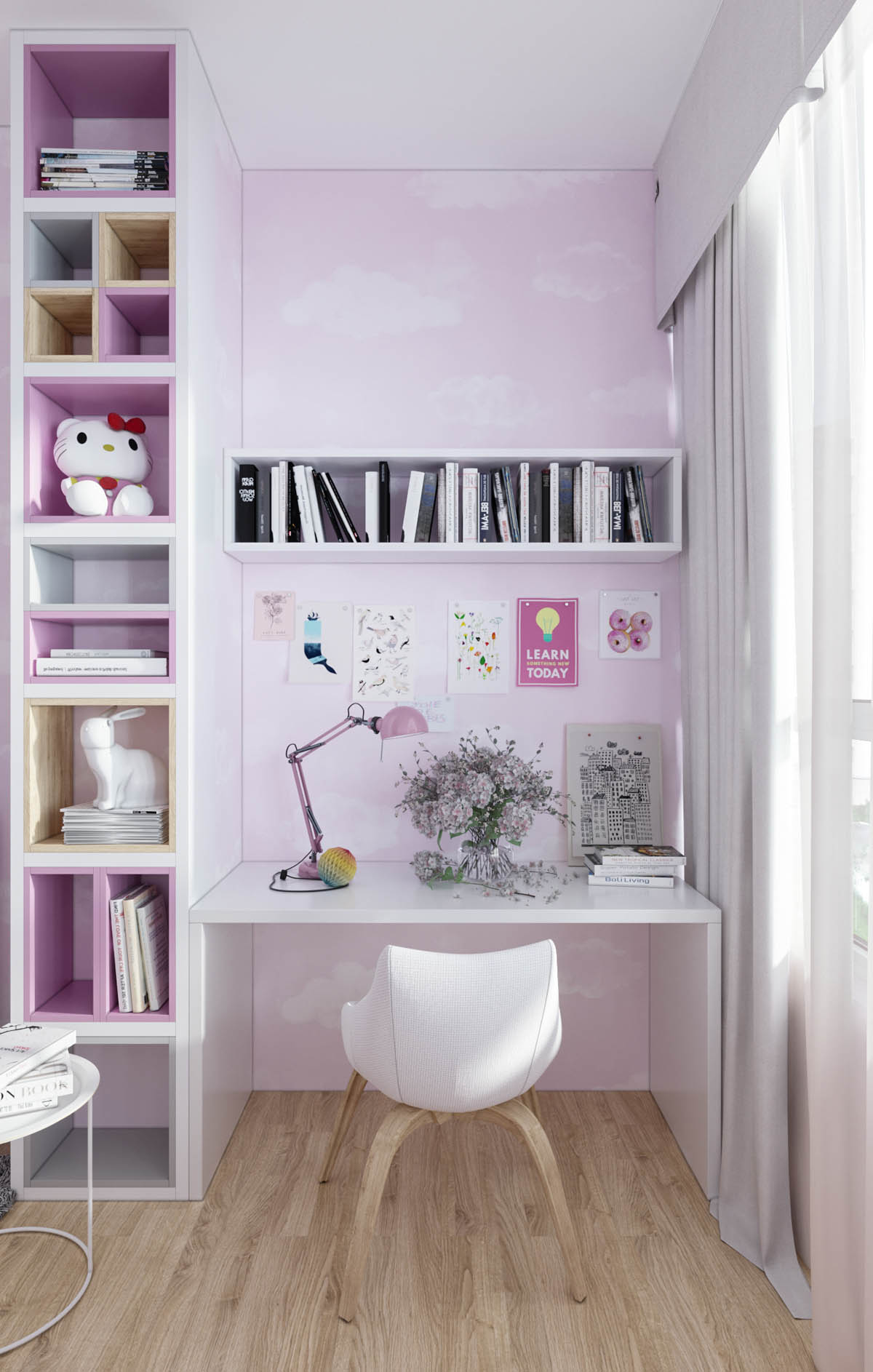 Chambre d'adolescente rose avec un bureau noir et un design original en pierre naturelle