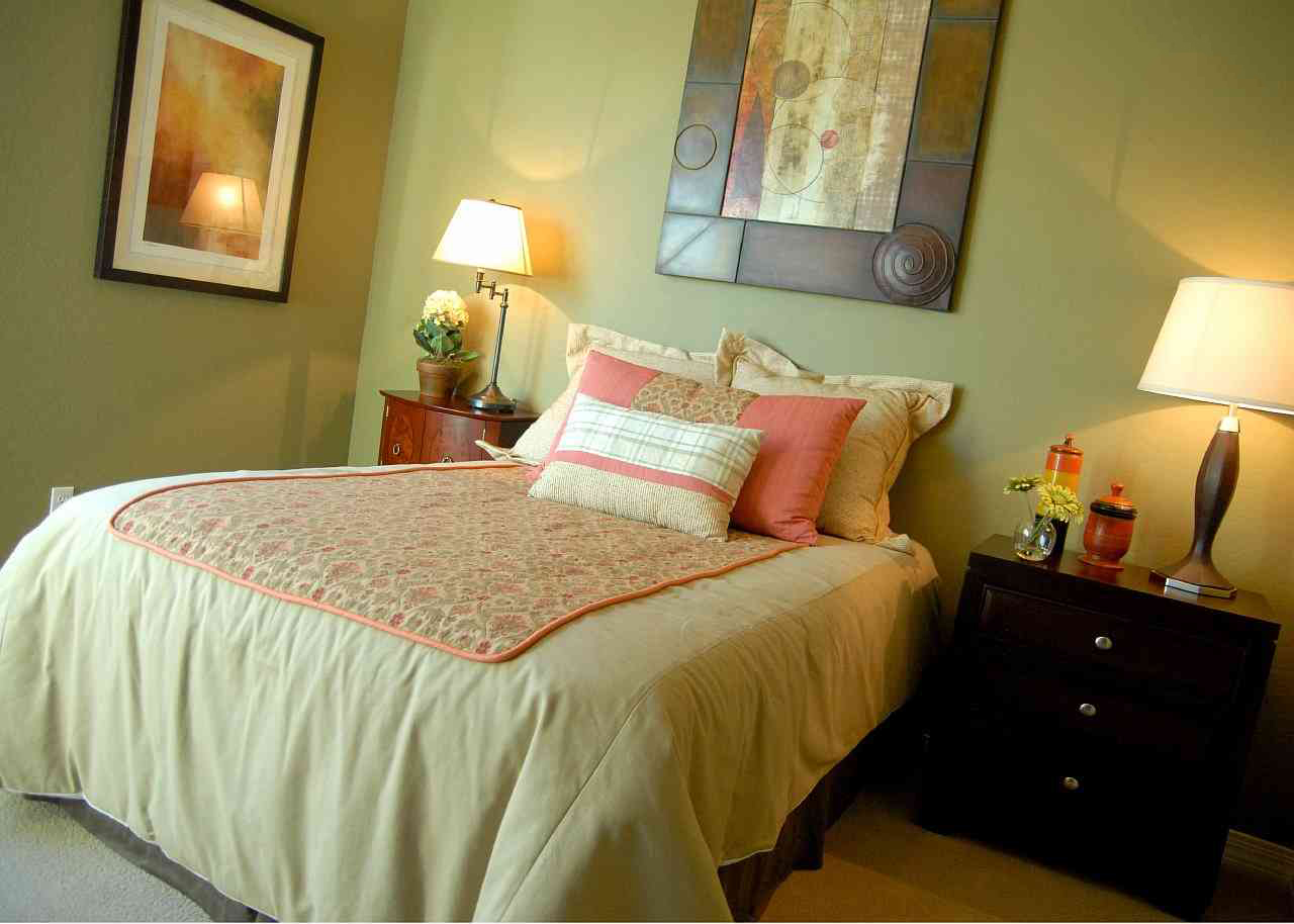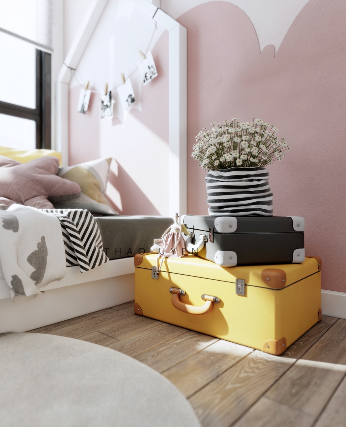 Une combinaison élégante de couleurs jaunes, roses et blanches à l'intérieur de la chambre avec un minimum d'éléments de décoration