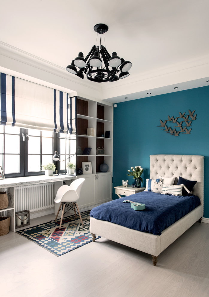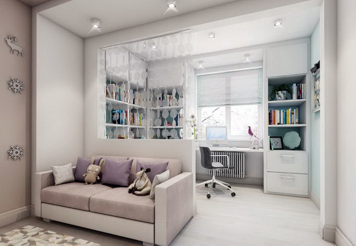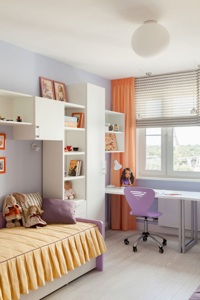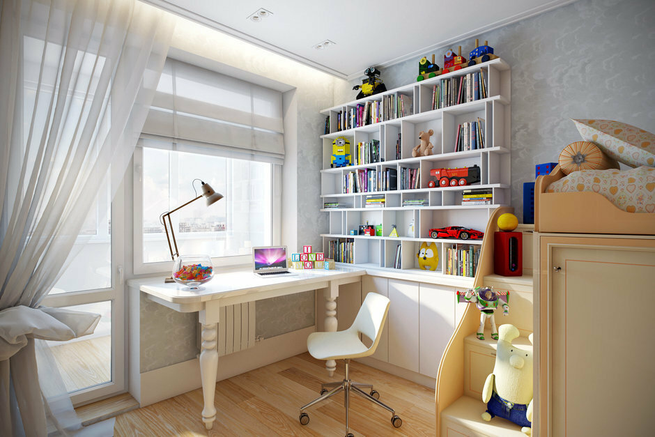 Pour l'utilisation la plus fonctionnelle de la zone de la chambre des enfants, les concepteurs recommandent d'utiliser la zone située directement en face de la fenêtre. Et comme ici, même dans une pièce faiblement éclairée, la plus grande quantité de lumière, cet endroit est idéal pour la zone de travail.
