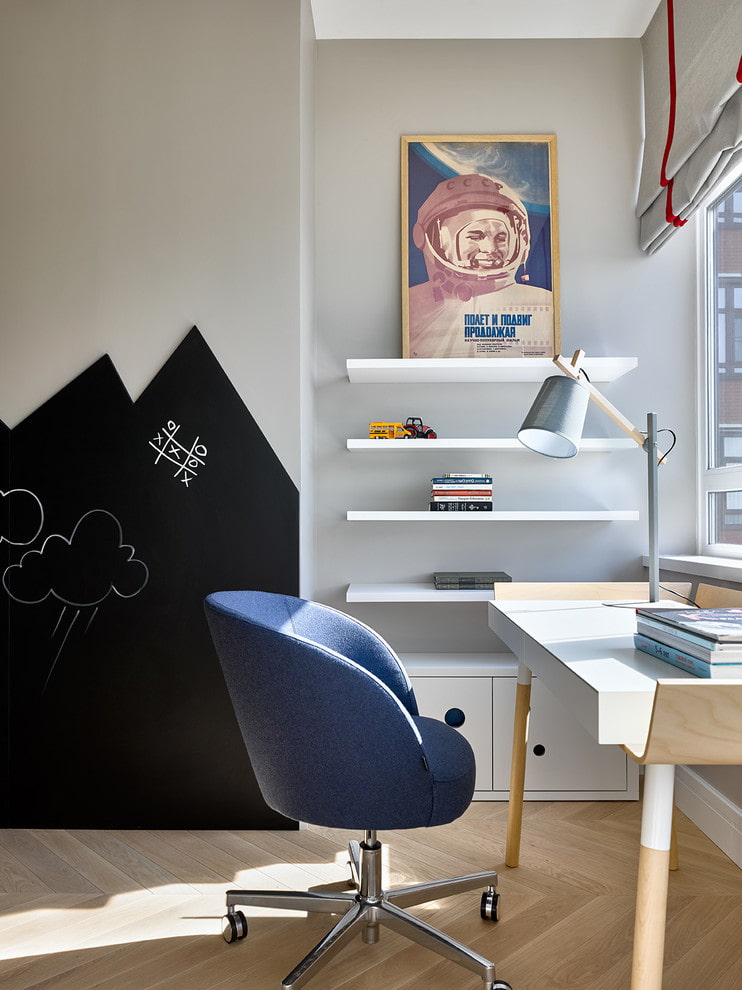 Les tableaux magnétiques, marqueurs ou en liège ne sont pas seulement un élément de décoration, mais l'appareil le plus utile. Les rideaux, la couleur de la table et de la chaise et un tapis doux sous les pieds sont également soigneusement sélectionnés.