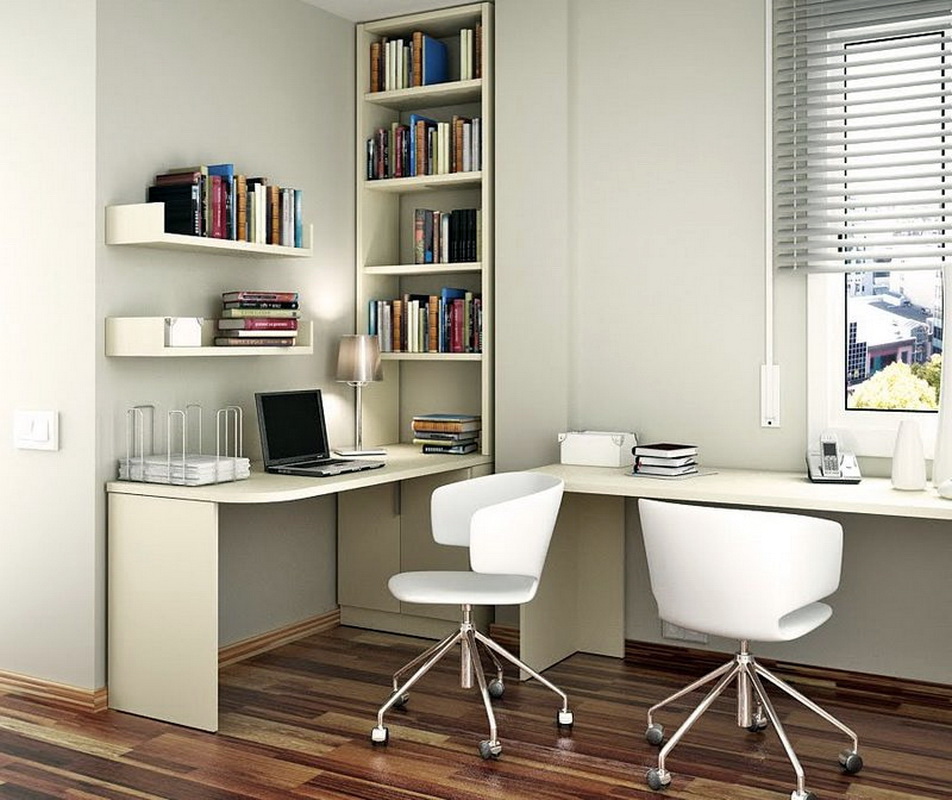Une table d'angle arrondie ou un modèle intégré à d'autres meubles convient dans une petite pièce