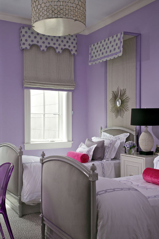 - Le violet est également considéré comme un ton froid, mais en même temps, il est parfait pour l'intérieur, en particulier pour la fille. Prenez la couleur lilas douce comme base - murs et meubles. Ajoutez des taches violettes vives - rideaux, textiles, meubles rembourrés. Juste un peu sombre ou vice versa blanc - dans le décor et les petites choses. La chambre sera donc très belle et volumineuse.