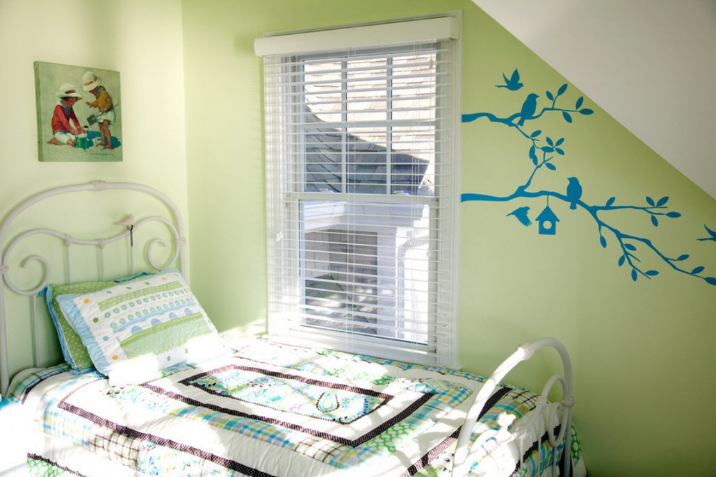 - Le vert est également chaud, idéal pour une chambre d'enfant. Par exemple, vous pouvez choisir une couleur vert pâle pour les murs et le sol de la pépinière, mettre un tapis vert foncé et le même plaid et rendre les meubles jaunes et orange. Ajoutez du blanc pour plus de fraîcheur et un enfant ou un adolescent vivra ici avec plaisir!