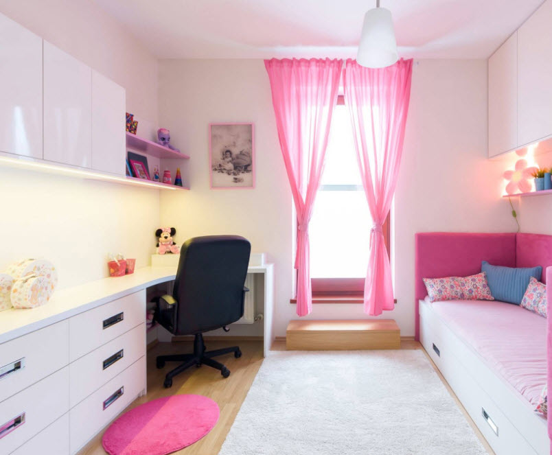Dans la chambre des filles, l'ergonomie de toute décoration intérieure joue un grand rôle. Surtout si la pièce est petite, il n'y a pas assez d'espace et vous devez économiser chaque mètre.