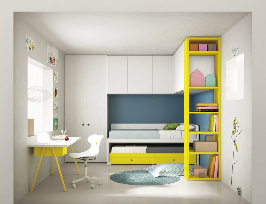 Heureusement, les fabricants modernes le savent et en tiennent compte. Il existe de nombreuses options intéressantes pour les meubles combinés. Par exemple, un mur compact, qui comprend une armoire et des étagères. Ou un lit haut avec tiroirs en dessous - une énorme économie d'espace! Et il existe même des casques complexes pour une utilisation optimale de l'espace: un bureau attaché à une petite armoire, et en haut au-dessus, c'est un lit. Eh bien, c'est très pratique, et même confortable et beau! Et une ergonomie maximale.