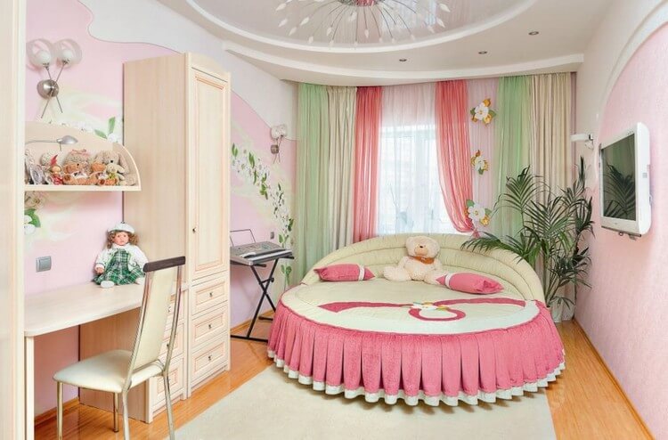 Dans la chambre pour la fille, vous pouvez commander un bel ensemble, composé de rideaux et de literie