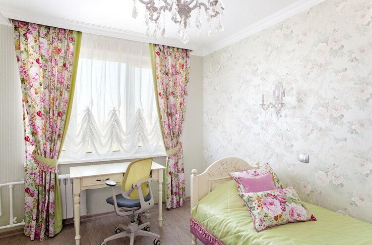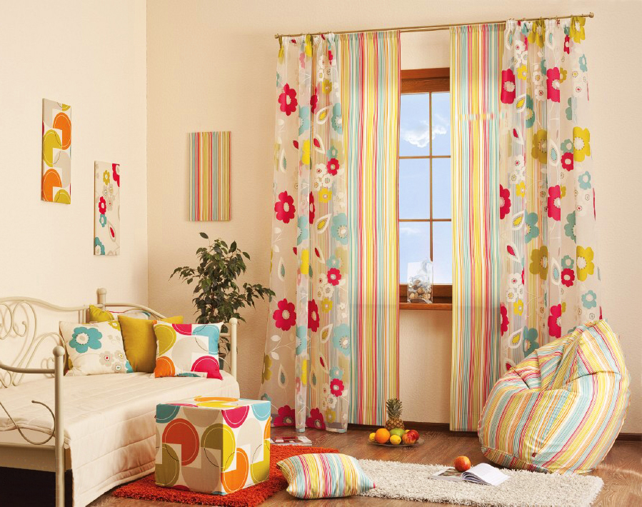 Des rideaux lumineux avec un imprimé coloré seront un excellent élément de décoration de la pièce intérieure pour une fille