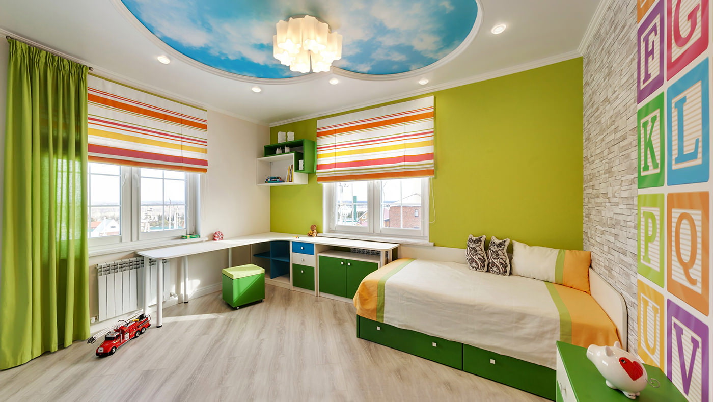 - Vert clair. La teinte verdâtre est utile pour les yeux, elle calme et ne distrait pas des cours. L'important est de ne pas trop assombrir l'intérieur - les rideaux ici seront vert clair, pomme, citron vert, malachite pâle. Les meilleures combinaisons sont avec un fond jaune, boisé et crème.