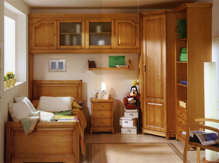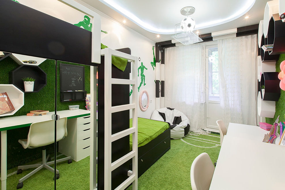 Le garçon a une petite armoire, mais beaucoup d'équipement sportif. Il n'a pas besoin d'un grand miroir, au lieu d'une table de chevet, vous pouvez clouer les étagères. Les garçons préfèrent les modules pliables pour que le lit d'une journée soit nettoyé sans problème inutile. Les jeunes hommes préfèrent le laconicisme, la rigueur, le côté pratique.