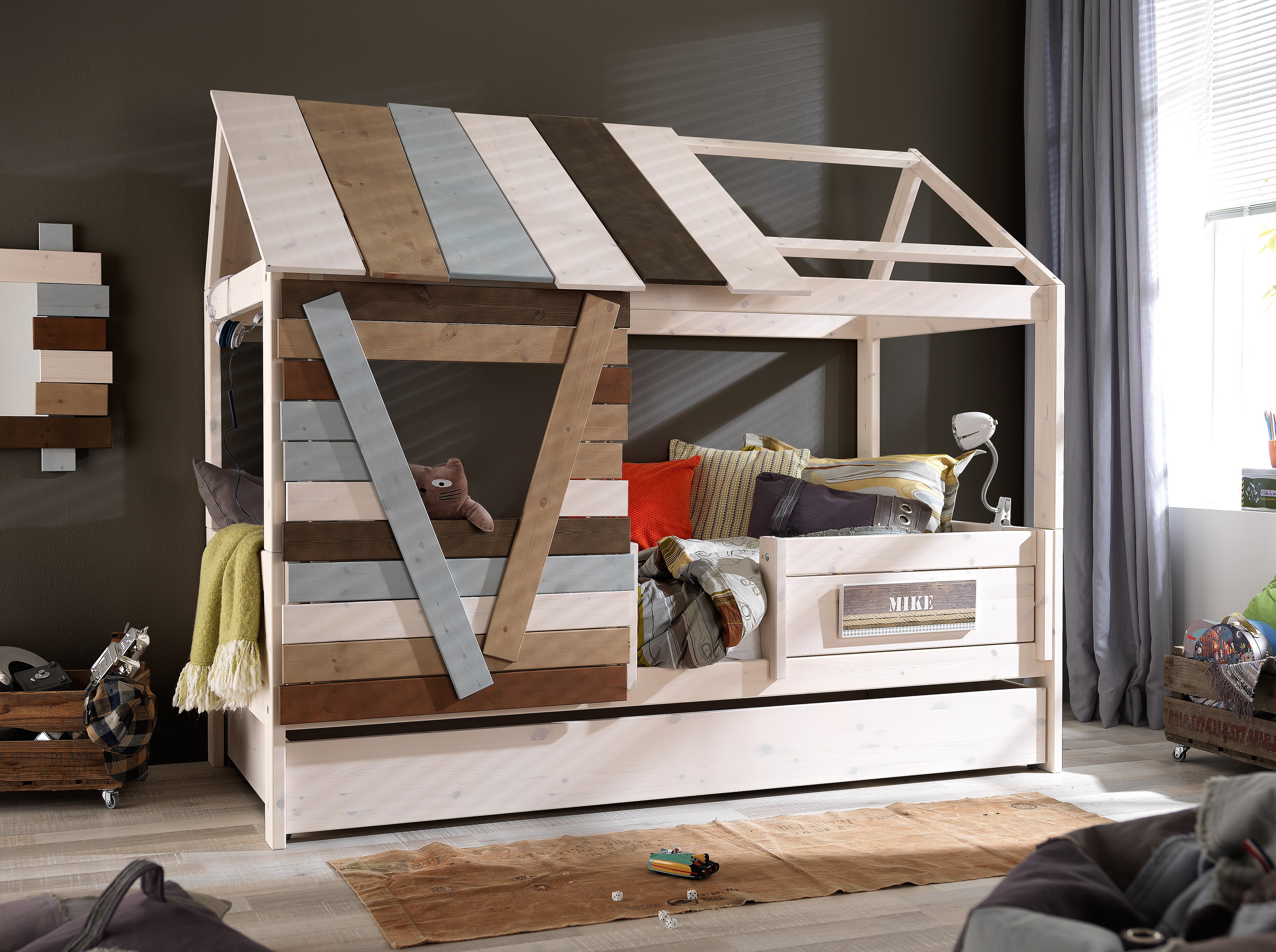 Lit superposé en bois avec tiroirs confortables dans les marches